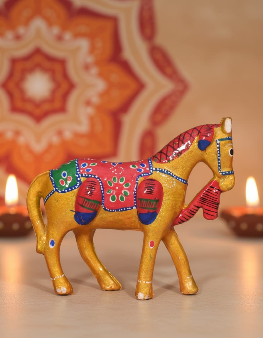 The 6 Inch Elephant Horse Blue Set reflects strength and grace with soothing blue tones and intricate traditional patterns. The 6 Inch Camel Green symbolizes harmony and freshness, adding a natural decorative charm to your space. The 6 Inch Camel Golden represents royalty and prosperity with its rich golden finish, making it ideal for festive décor and gifting.